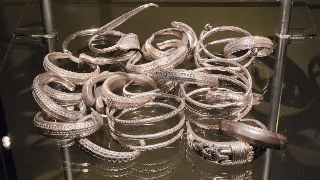 There were a lot of things that have been dug up in “hoard finds” and “grave finds”. I’ve read that Vikings usually buried their treasure hoards somewhere on their property and that there were thousands of Viking hoards in Sweden and Norway. Here’s a bunch of silver arm rings.