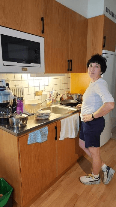 We’ve had three museum days in a row now so we decided to take today off. We took it easy this morning and I spent some time on the laptop updating our Travel Tales and completed some cost tracking spreadsheets. Around mid-morning we walked to the grocery store and Patti got supplies to make lunch. Here she is in the kitchen. preparing our meal of chicken, carrots and potatoes.