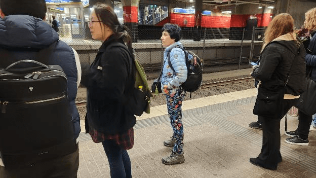 Around 6PM we were ready to head back to our AIrbnb, so we walked to the nearest subway entrance, stopping at a grocery on the way for some provisions. I have really been enjoying riding the subways here in Stockholm, the smells of creosote and ozone remind me of my life in New York City in the early 1980s when I rode the subway almost every day. Here’s Patti on one of the platforms. As usual, she’s very colorful compared to the locals.