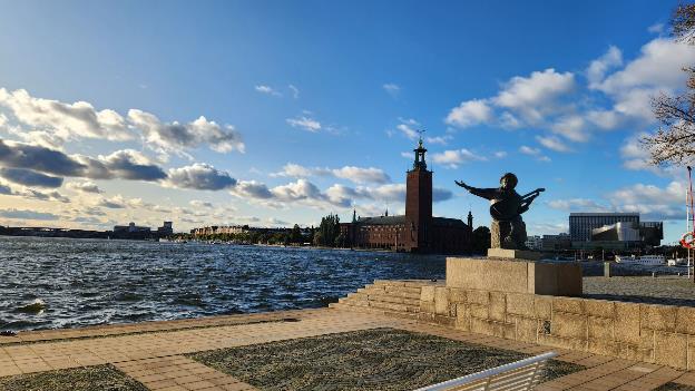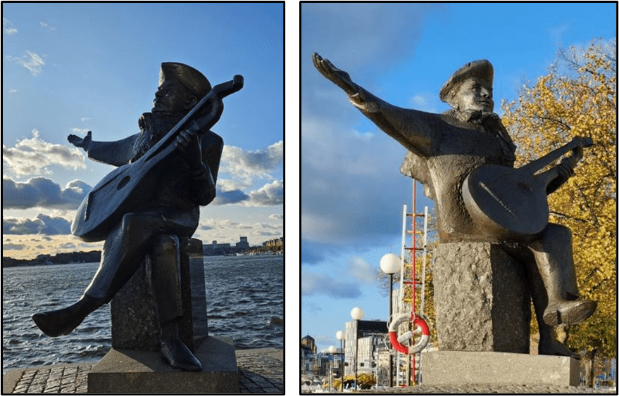 “Evert Taube’s terrace is a paved place on the western side of Riddarholmen in Stockholm. The terrace is located between the Wrangel Palace and Riddarfjärden and is part of the Northern Riddarholmen Harbour. On Evert Taube’s terrace has been Taube’s statue since 1990, sculpted by Willy Gordon. Evert Taube’s terrace was built in the early 1960s and was named in 1983 after the troubadour Evert Taube. In 1990, to commemorate the 100th anniversary of Taube’s birth, a bronze sculpture by Willy Gordon, depicting Evert Taube, wearing a sombrero and poncho, was erected. In one hand he holds his lute, with the other he points over Riddarfjärden and Södermalm, where he lived. Behind him rises Stockholm City Hall. The sculpture was a gift from the Friends of the Evert Taube Society. The plinth is carved of granite from Vinga, Taube’s birthplace.”