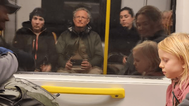 The temperature was dropping through 40°F at this point and there was a stiff breeze off the lake so we decided to call it a day. We took the subway home and I got this picture of us reflected in the window with some of our fellow travelers.