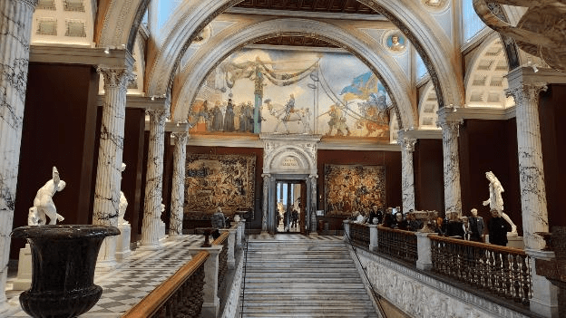 There are lots of magnificent sights at this museum. This is what the staircase to the top floor looked like. There was a giant wall painting over the door and two big tapestries on either side.
