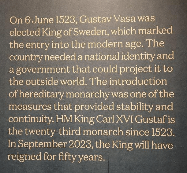 There’s a special exhibition right now that spans 500 years of Swedish history from 1523 to 2023. We remembered that the current king is celebrating his 50th year as king this year, his Jubilee. We went into the special exhibition first. They emphasized that Sweden’s hereditary monarchy has lasted 500 years.