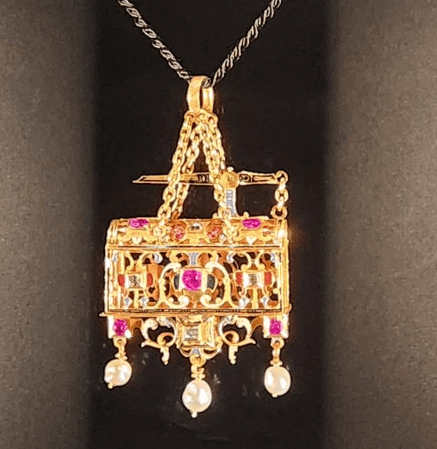 “Mentioned in a 1630 inventory of King Gustav II Adolf’s costume jewelry, the pendant is most likely the “treasure”, in the form of a rat trap, that Duke Johan Adolf of Holstein-Gottorp acquired in 1592, the year his sister Kristina was outfitted for her wedding to King Karl IX of Sweden.”