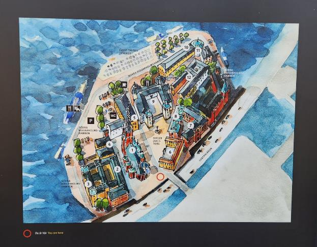 Since we were close to the island of Ridarholmen and there was plenty of daylight left we decided to walk over there to see the church and terrace that we’ve read about in the tourist books. We found a nice picture/map of the island on a sign.