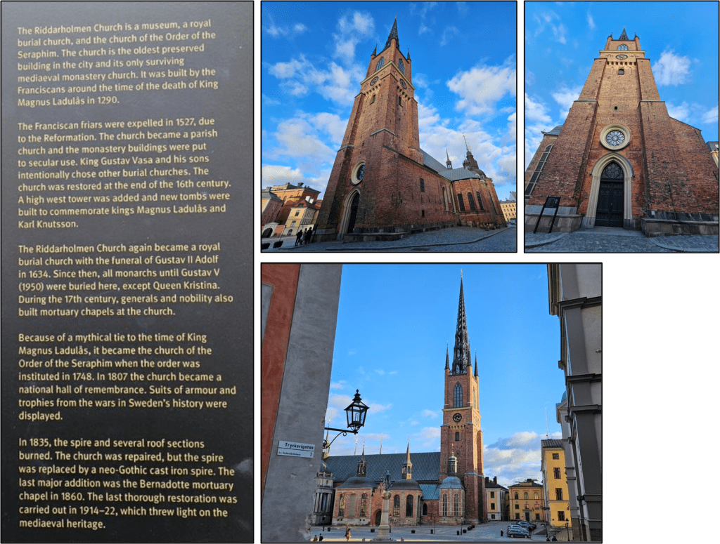“The Riddarholmen Church is a museum, a royal burial church, and the church of the Order of the Seraphim. The church is the oldest preserved building in the city and its only surviving medieval monastery church.”