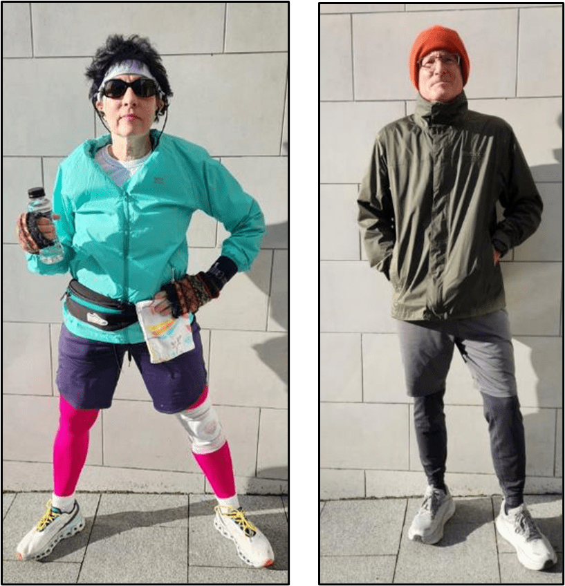 This morning, I went for a jog and Patti went for a run. The temperatures were in the low 40s, so we dressed up warmly. Here we are in our workout costumes — which of us is more colorful / fashionable?