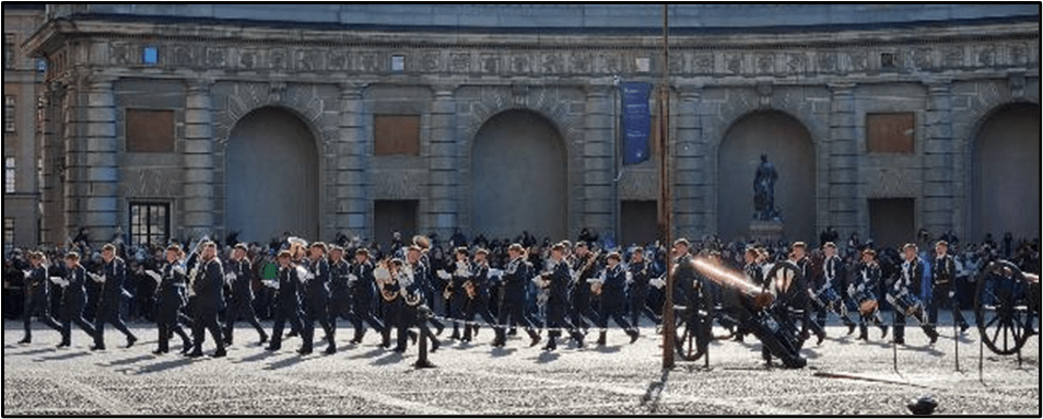 The old group of guards marched out and the new group marched in.