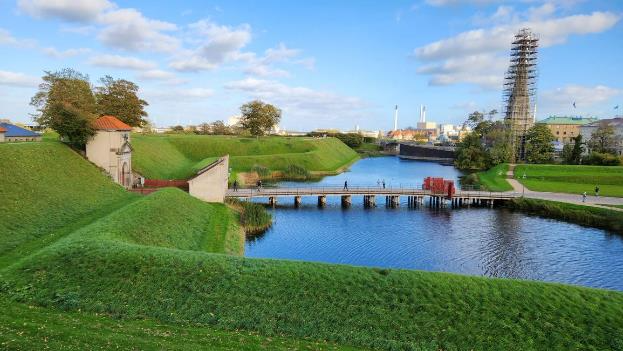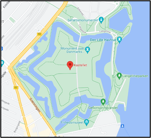 “Kastellet is a citadel located in Copenhagen, Denmark. It is one of the best preserved fortresses in Northern Europe. It is constructed in the form of a pentagon with bastions at its corners. Kastellet was continuous with the ring of bastioned ramparts which used to encircle Copenhagen but of which only the ramparts of Christianshavn remain today. A number of buildings are located within the grounds of Kastellet, including the Citadel Church as well as a windmill. The area houses various military activities but it mainly serves as a public park and a historic site.”