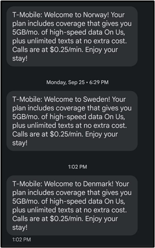After the train crossed the long bridge from Sweden into Denmark, we both received the standard notice from T-Mobile welcoming us to a new country. I saved the ones from Norway and Sweden too.