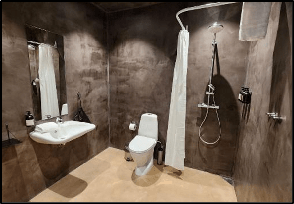 The bathroom is roomy. The shower is typical of what we’ve seen in Scandinavia. There’s a drain in the corner and a shower curtain you can close to keep most of the spray from spreading around the bathroom. We bought a squeegee so we can move the water towards the drain after a shower.