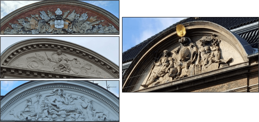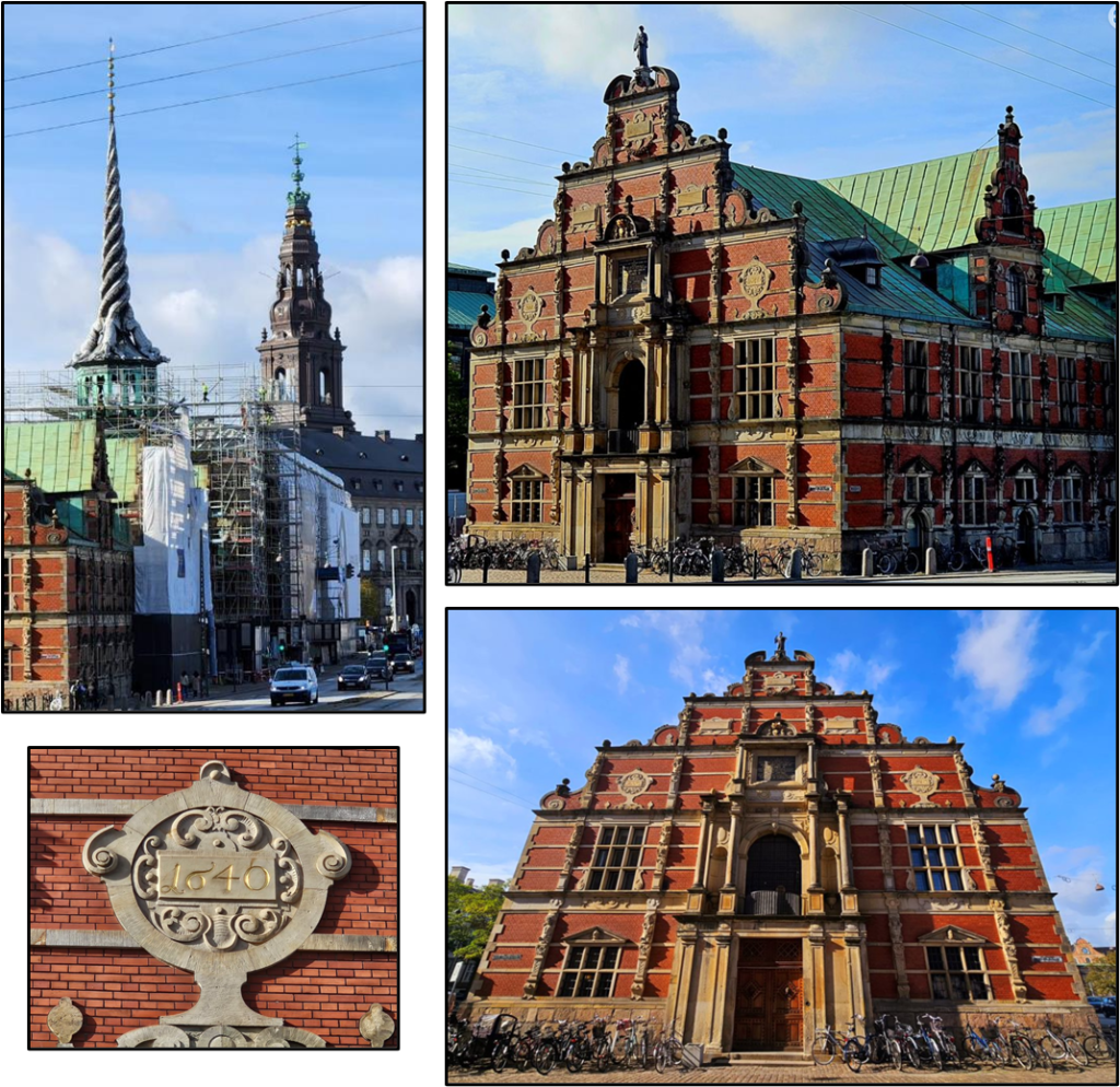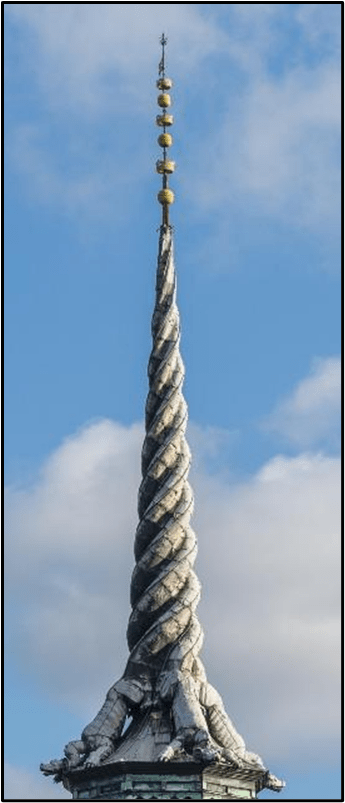 We are amazed at the many spires on top of buildings we are seeing here in Copenhagen — and they are not all located on top of a church. In the picture on the top left below, the bottom of the spire on the left is shaped like four dragons with their tails entwining. It’s located on the old stock exchange building (the other three pictures) that was built in 1646.