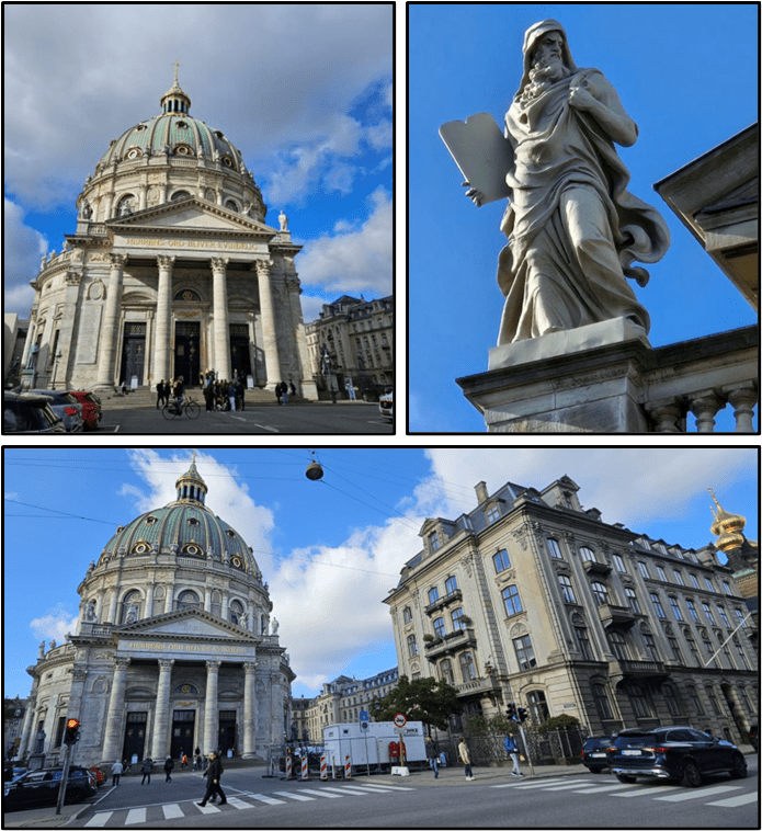 “Frederik’s Church (Danish: Frederiks Kirke), popularly known as The Marble Church (Marmorkirken) for its rococo architecture, is an Evangelical Lutheran church in Copenhagen, Denmark. The church forms the focal point of the Frederiksstaden district; it is located due west of Amalienborg Palace.”