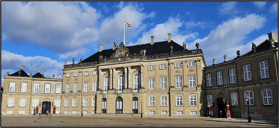 “Amalienborg is the official residence for the Danish royal family, and is located in Copenhagen, Denmark. The Danish Head of State, Queen Margrethe ll, resides in the palace during autumn and winter. It consists of four identical classical palace façades with rococo interiors around an octagonal courtyard (Danish: Amalienborg Slotsplads); in the center of the square is a monumental equestrian statue of Amalienborg’s founder, King Frederick V. Amalienborg was originally built for four noble families; however, when Christiansborg Palace burned on 26 February 1794, the royal family bought the palaces and moved in. Over the years various monarchs and their families have resided in the four different palaces.”