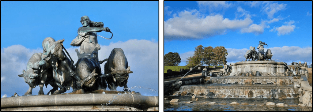 “The Gefion Fountain is a large fountain on the harbor front in Copenhagen, Denmark. It features a large-scale group of oxen pulling a plow and being driven by the Norse goddess Gefjon. It is located in Nordre Toldbod area next to Kastellet and immediately south of Langelinie.”