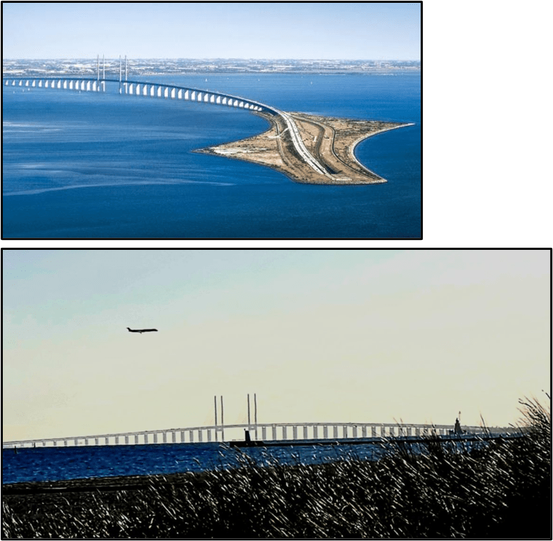 “The Øresund or Öresund Bridge is a combined railway and motorway bridge across the Øresund strait between Denmark and Sweden. It is the longest in Europe with both roadway and railway combined in a single structure, running nearly 8 kilometres (5.0 miles) from the Swedish coast to the artificial island Peberholm in the middle of the strait. The crossing is completed by the 4-kilometre (2.5 mi) Drogden Tunnel from Peberholm to the Danish island of Amager.”